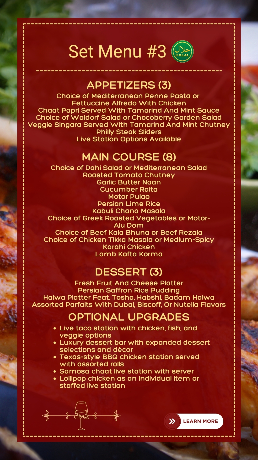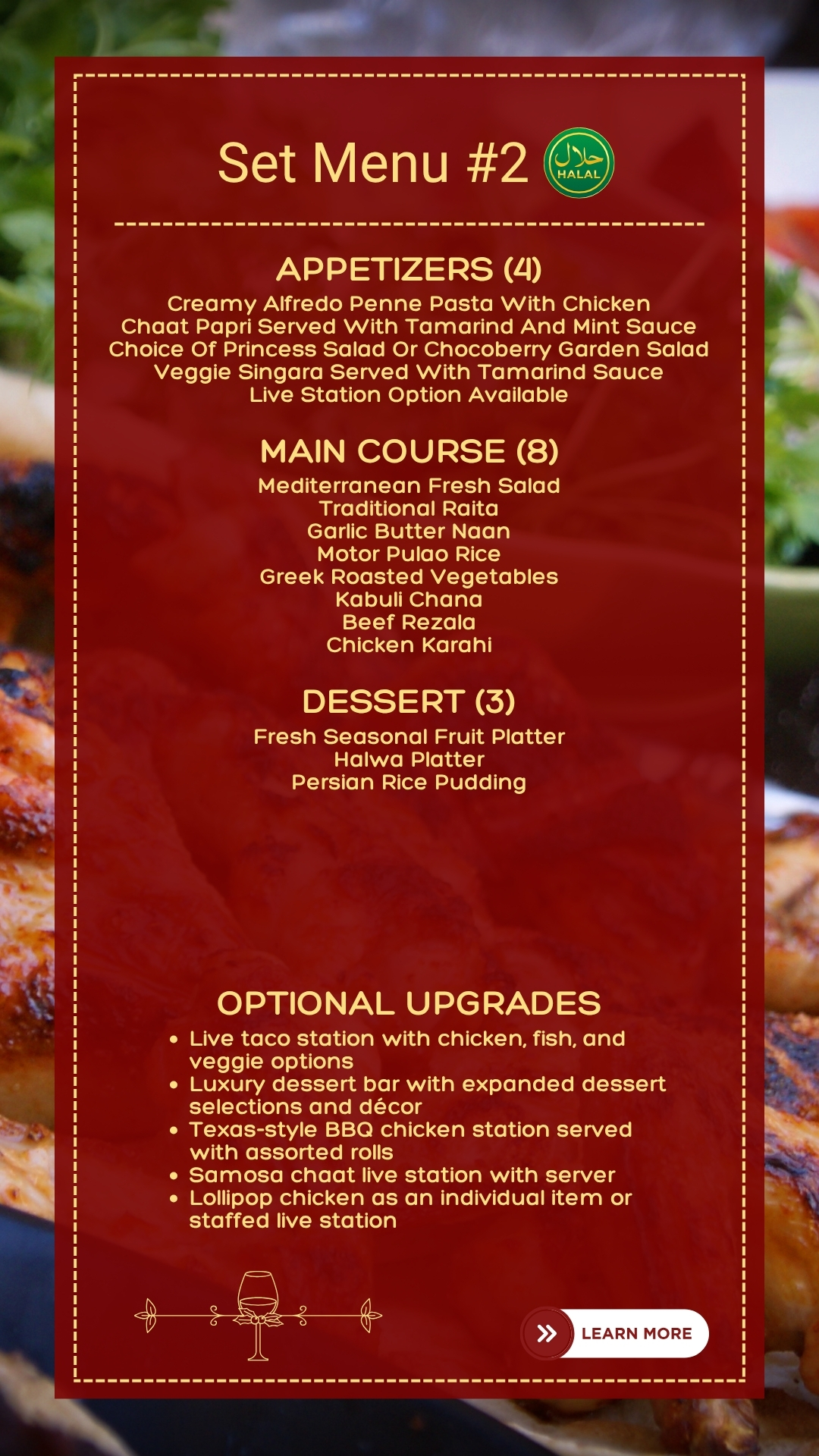 Please note: Servers are available at an additional cost. We also offer customized menus tailored to your specific events and programs. For a free quote and to discuss your needs, please call us directly at 571-237-2592.
